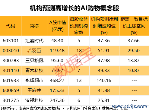 机构预测上涨空间逾10%的AI购物概念股还有若羽臣、三只松鼠、青木科技。